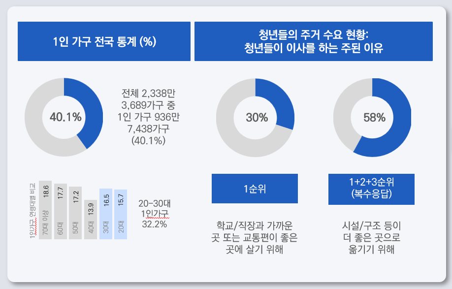 청년 1인 가구주들은 새로운 거주지를 찾을 때 통근조건, 교통시설, 그리고 주거시설의 적합성을 주요하게 살핀다. 하지만 위 요건들을 모두 만족하는 입지의 부동산 실거래가는 매우 높기 때문에 경제적 부담감이 크다. 경제적 부담을 최소화하기 위해 어쩔 수 없이 생활 및 교통 편의성을 포기하거나 저렴한 주거형태인 반지하/옥탑방/고시원을 찾는 경우도 있지만, 이는 경제활동과 자기계발에 힘을 쏟는 시기인 청년기에 큰 걸림돌이 되거나, 범죄에 취약한 환경에 노출될 위험이 크다.
