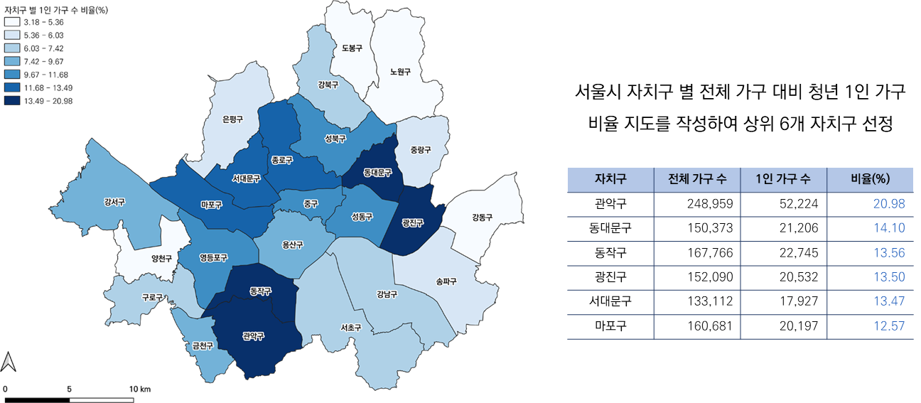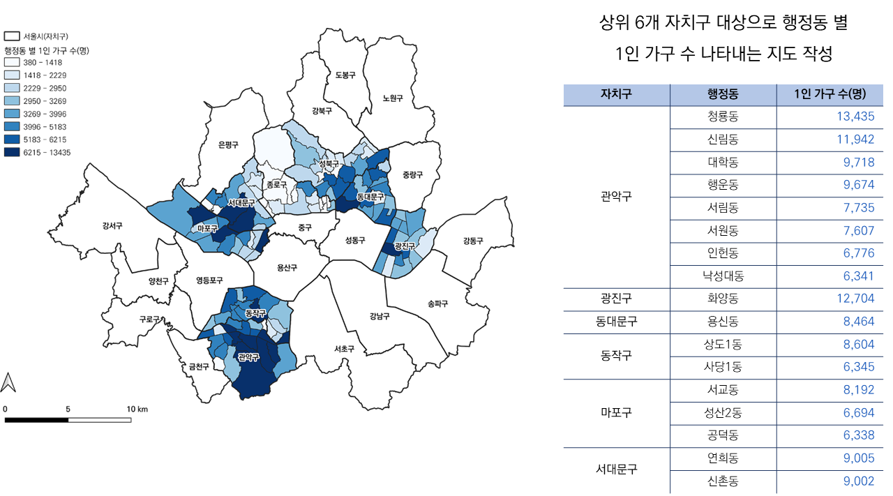 *청년 1인 가구 수*는 자치구별로만 제공되는 데이터였고, 동 별로는 데이터가 존재하지 않았다. 하지만 나는 특정 '동'으로 대상지를 좁혀 필지를 분석해야 했기 때문에 행정동별로는 대체 지표로 *1인 가구 수*를 택했다.