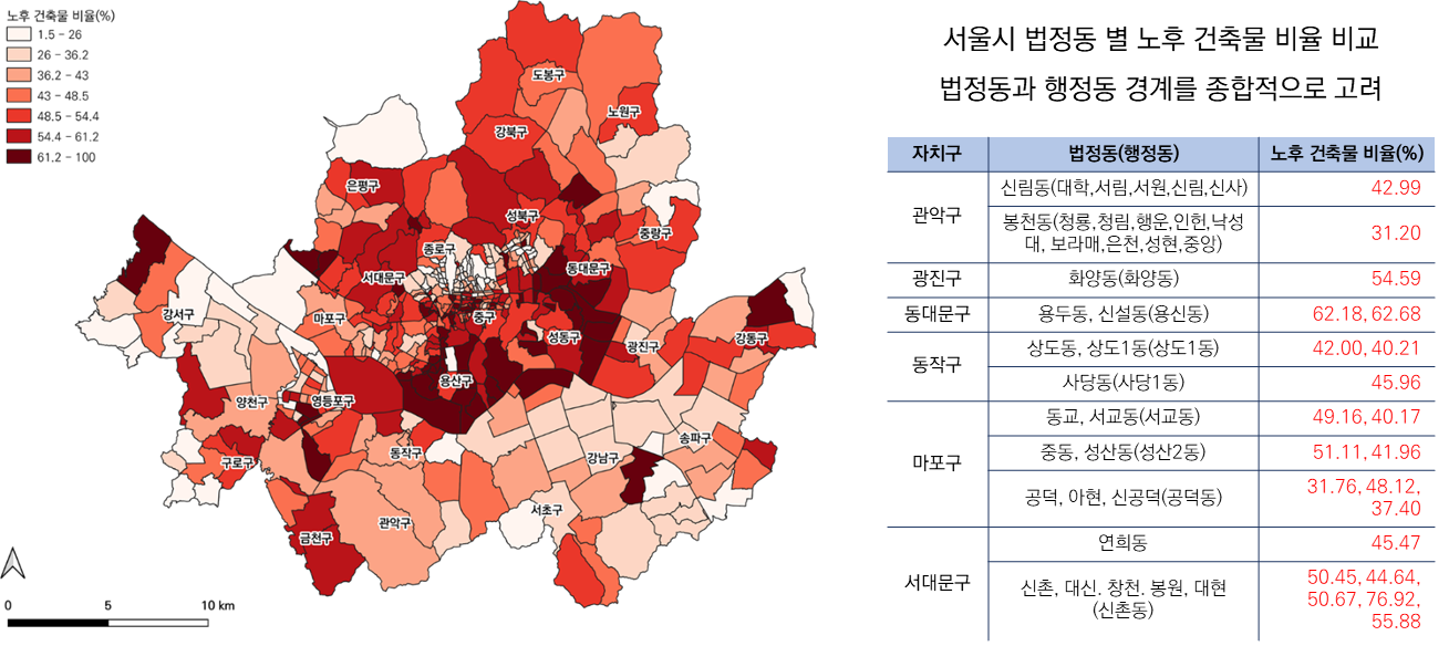 노후 범위 30년 이상인 건축물 비율 = (준공 30년 이상의 건축물 수) / (전체 건축물 수) 로 측정했다.