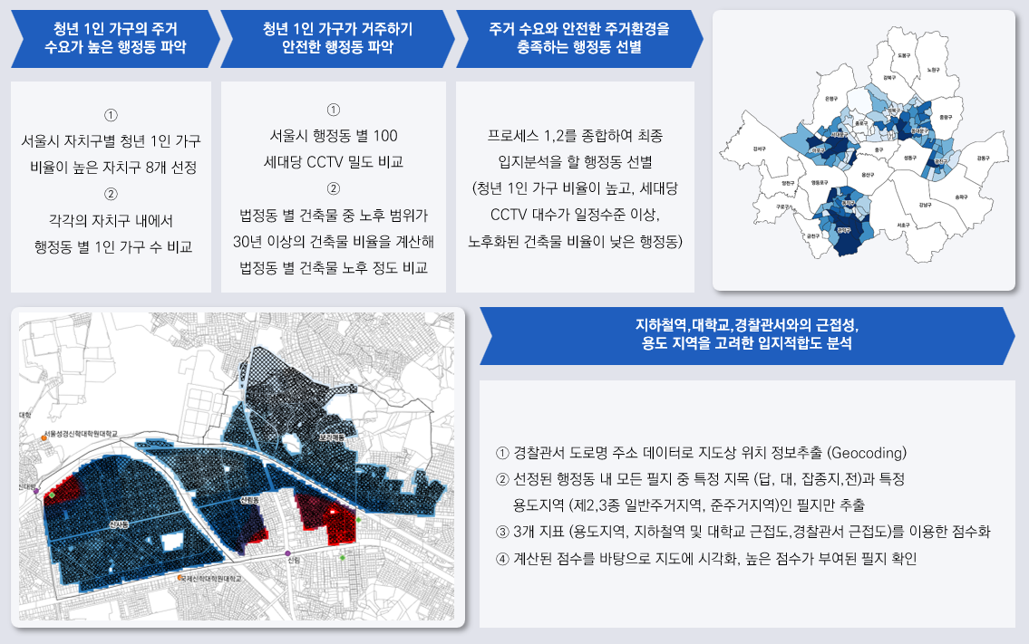 (동작구, 관악구) 생활권에서 동작구의 2개 동은 cctv 밀도로 탈락, 관악구에서 청룡동은 청룡산, 근린공원, 아파트가 부지의 대부분을 차지한다는 조사 결과에 따라 새로운 입지 탐색 기회의 부족으로 탈락했다. 차선책으로 두번째로 1인 가구의 수요가 높은 신림동만을 택하려 했으나 연희동과 비교해서 대상지 면적이 매우 작아 <신림동과 인접한 신사동, 보라매동>까지 묶어 입지를 분석하기로 했다.