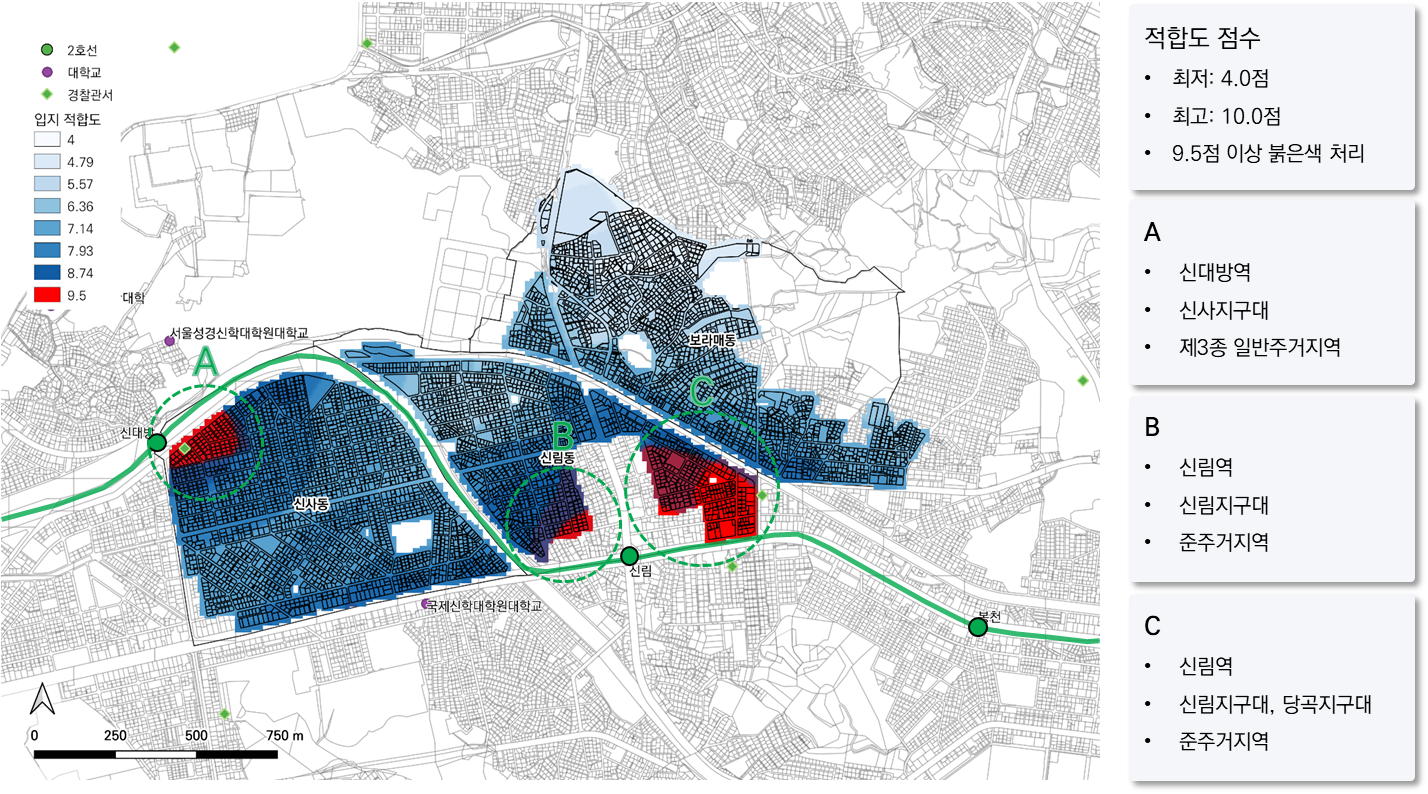 연희동과 같은 방식으로 관악구의 신사동, 신림동, 보라매동을 종합하여 분석한 대상지는 연희동에 비해 용도지역 조건에 부합하는 필지가 많았다. 녹지나 산지가 없고 일부 일반상업지역인 필지만 제외됐다. 이 대상지에서는 최저 4점에서 최대 10점까지의 적합도 점수가 나타났으며 9.5점 이상의 높은 점수가 매겨진 픽셀들을 붉은색으로 강조했다.