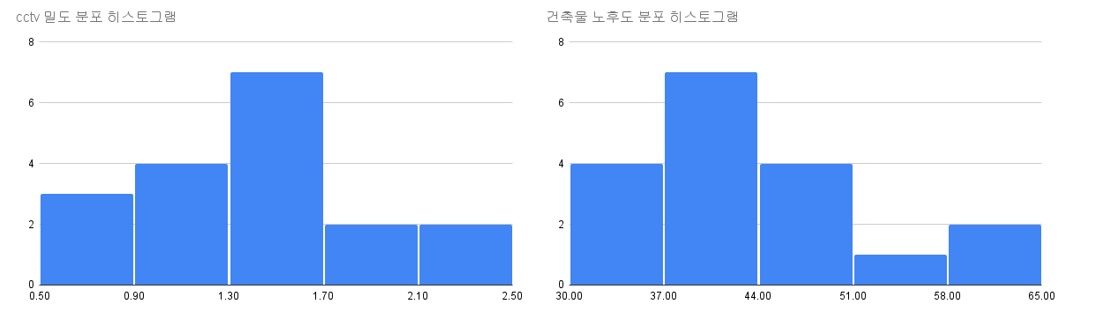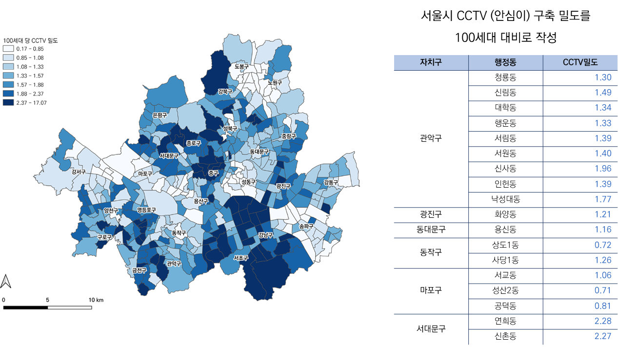 주거 환경 (안전)과 관련된 지표의 첫번째 고려사항은 cctv 설치대수였다. 처음에 단순히 동별 cctv 설치대수로만 비교하려 했다. 하지만 실제 cctv 설치 위치를 서울시 지도 위에 점으로 표시하니 cctv가 지나치게 많이 설치된 특정 공간과, 아예 설치되지 않은 공간이 명확히 대비되었다. 산과 강이 차지하는 공간이 많은 동은 cctv가 드물게, 완전한 도심으로 빽빽하게 발달된 동은 cctv가 아주 많이 설치되어 있었다. 따라서 동별 거주 세대 수 대비 cctv 수로 지표를 개선했다.