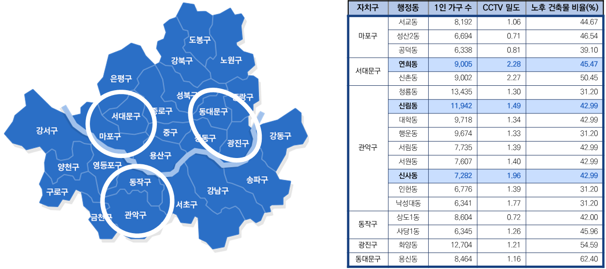 모든 동을 분석하기에는 행정동의 수가 너무 많아, 6개의 자치구를 3개의 인접 생활권으로 묶어 각 지역별로 대상지를 하나씩 선정함을 목표로 했다. (서대문구, 마포구), (동작구, 관악구), (동대문구, 광진구)로 묶을 수 있었다.