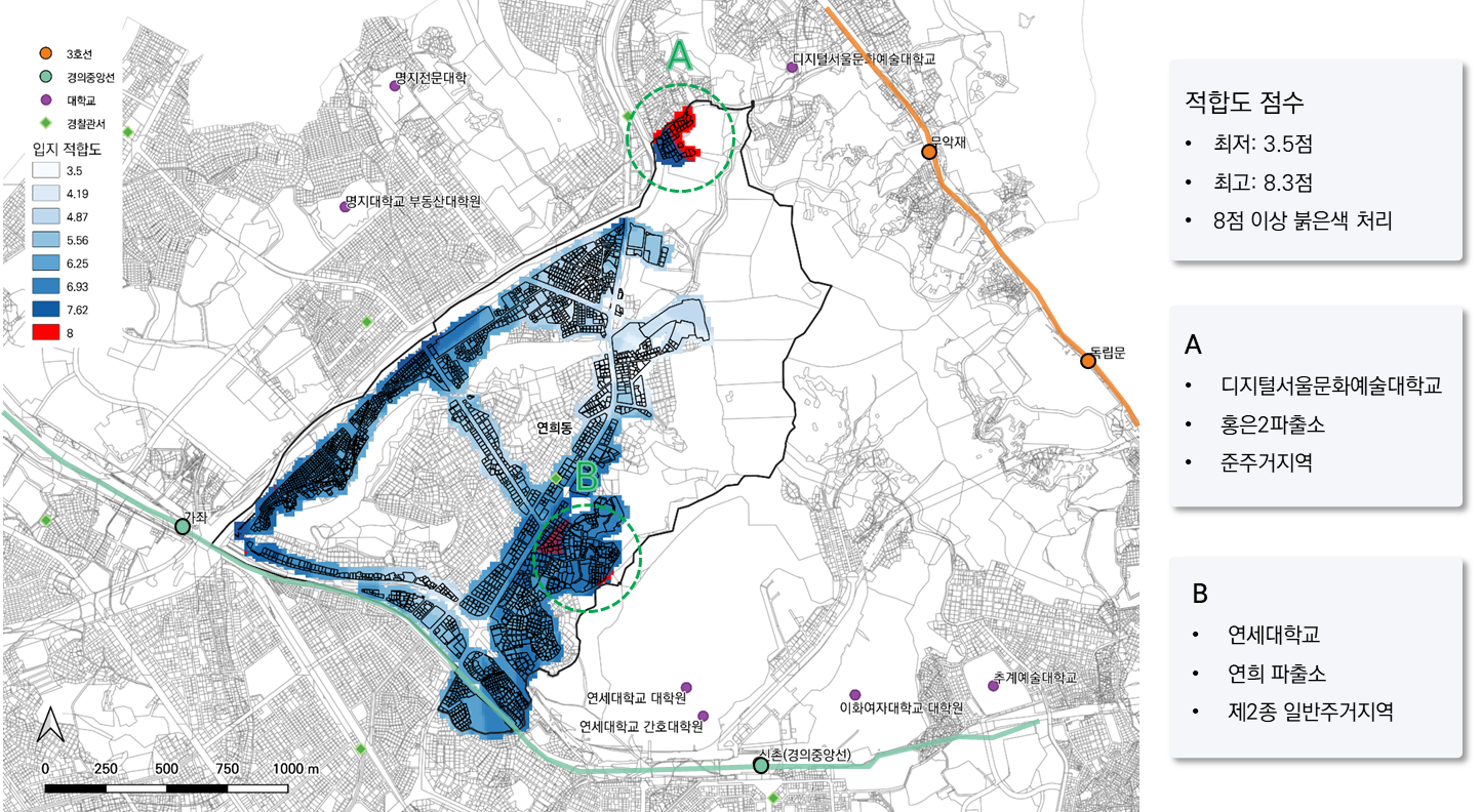 앞선 글에서 정한 방식대로의 가중치를 3가지의 지표에 적용하여 픽셀별 점수를 부여하고 (10점 만점) 점수에 따라 지도에 시각화 한 결과이다. 연희동 내인데 현재 색칠이 안되어 있는 공간은 주택을 지을 수 있는 용도지역이 아니거나(산지/공원), 분석 용도에서 제외한 제1종 일반/전용 주거지역에 해당한다 . 적합도 분석 결과, 픽셀들에는 최저 3.5점에서 최고 8.3점까지의 점수가 매겨졌다. 범례에 나와있듯이 8점 이상은 제일 점수가 높기 때문에 붉은색으로 표시하고 나머지 지역은 적합수록 진한 파란색으로 표시됐다.