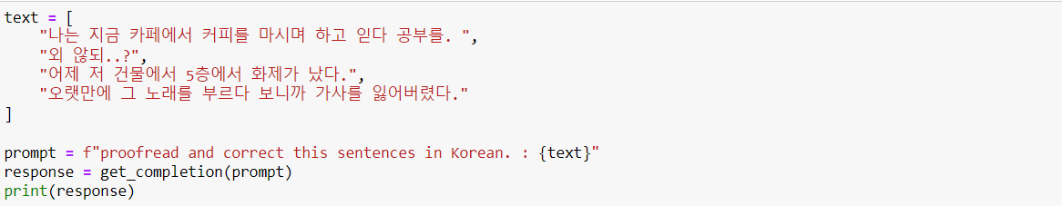 이 경우에는 prompt에 꼭 "proofread and correct the following text and rewrite the corrected version." 이라고 적어주는게 좋다.