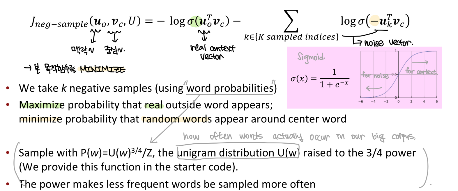 1강에서 설명한 word2vec 방법은 'SG' 방법이었던 것이다. (중심단어로 c가 나올 때 문맥단어로 o가 나올 확률계산)