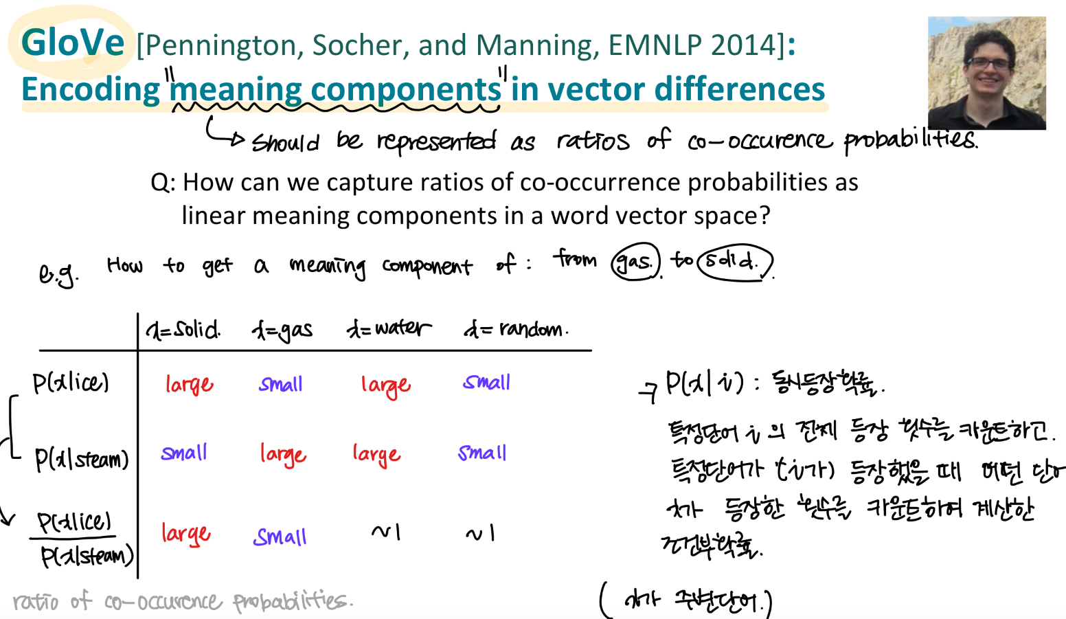 해석의 예를 들어보자면, 'ice'라는 단어 주변에 'solid'라는 단어가 나올 확률은 'steam'이라는 단어 주변에 'solid'라는 단어가 나올 확률보다 매우 높다. 한편, 'ice'라는 단어 주변에 'water'이라는 단어가 나올 확률과 'steam'이라는 단어 주변에 'water'라는 단어가 나올 확률은 거의 비슷하다.