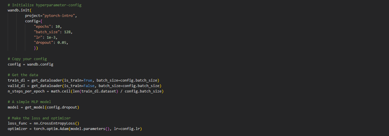 hyperparameter으로 epoch, learning rate, batch size, dataset, model architecture, seed값 등 다양한 것을 설정해주는 config 파일을 init해준다.