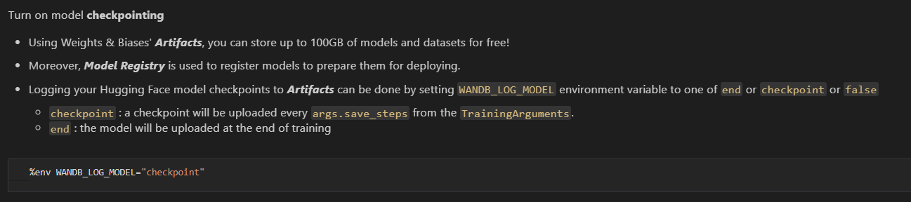 checkpointing 작업을 WandB 페이지 상에서 하려면 environment를 trainer 함수 init 전에 해줘야 한다.