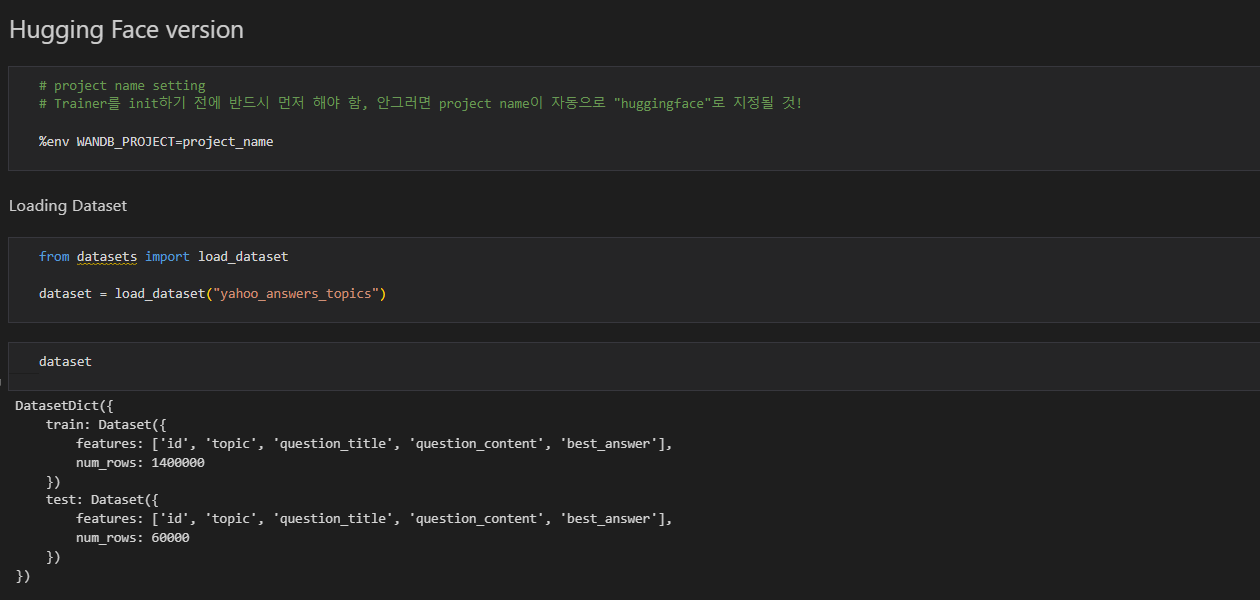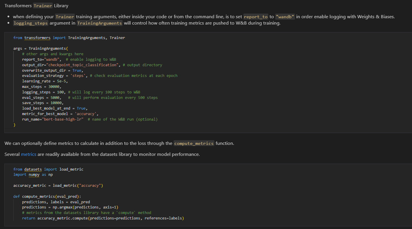 허깅페이스 Transformers 라이브러리로 워낙 좋은 nlp 모델들을 쉽게 불러올 수 있기 때문에 WandB에서도 허깅페이스의 라이브러리를 활용한 Training tutorial 또한 소개해두었다.