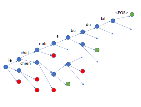이 때 vocabulary에 있는 단어들 중 가장 나올 확률이 높은 단어로만 선택하여 텍스트를 생성해나가는 inference 방식을 : greedy inference라고 한다. 하지만 한 번 n번째 단어로 특정 단어를 선택한 이후, n+1번째 단어를 선택하면서 문장이 어색해지더라도 다시 돌아갈 수 없으며 이에 따라 가장 높은 확률의 단어들로만 뽑아서 조합한 문장은 완벽하지 않을 수 있다는 문제가 있다.