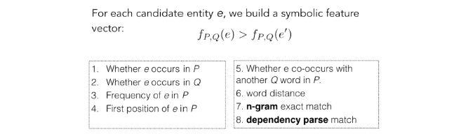 해당 task를 해결하기 위해 제시된 방법1은 'Entity-Centric Classifier' 이다. feature engineering의 작업을 통해 candidate entity에 대해 아래와 같은 식을 적용하여 최종 답을 찾아내는 전통적인 feature-based classifier 방식으로, 성능개선에 한계가 있었다.