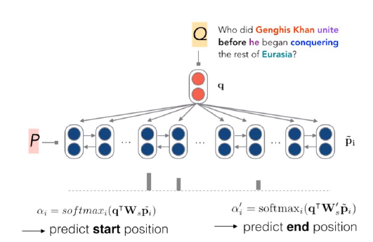- question embedding (q)와 모든 contextual embeddings ( ˜ pi ) 를 비교하여 q와 관련이 있는 정보를 P(passage)에서 찾는다.
