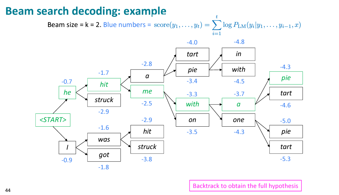 Beam search 방식은 다음으로 출력될 수 있는 단어 후보의 갯수(k=beam size, practically 5~10)를 정하고, 그 후보들로 <EOS> 토큰이 생성될 때까지 문장을 생성하는 방식이다. (각각의 문장을 hypothesis라고 부름) hypothesis score은 joint probabaility로 계산되며, 이 score가 가장 높은 hypothesis가 최종 선택 문장이 된다. (단, 문장이 길어지면 probability가 작아질 수 밖에 없어서 문장의 길이로 점수를 정규화해준다.) 우측 그림은 k=2인 경우의 도식이다.