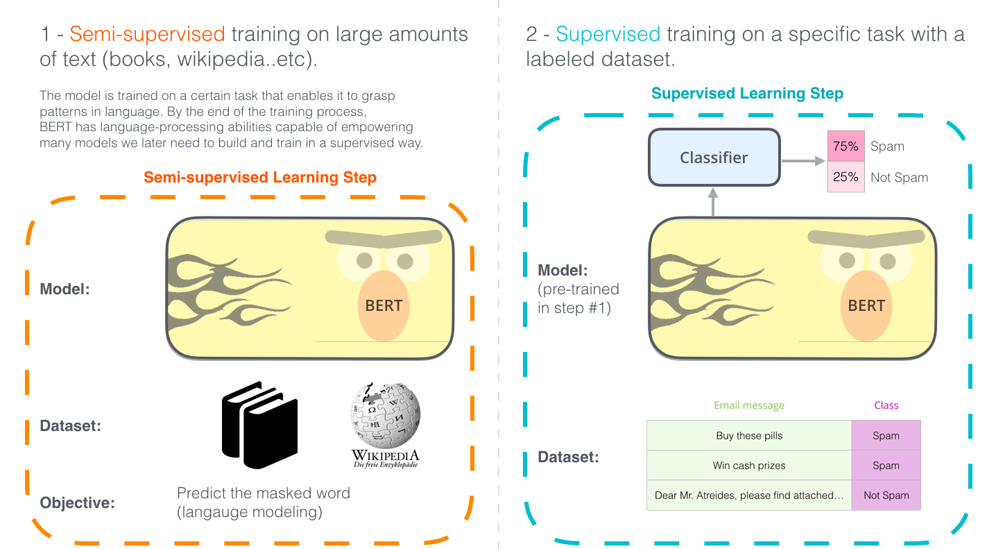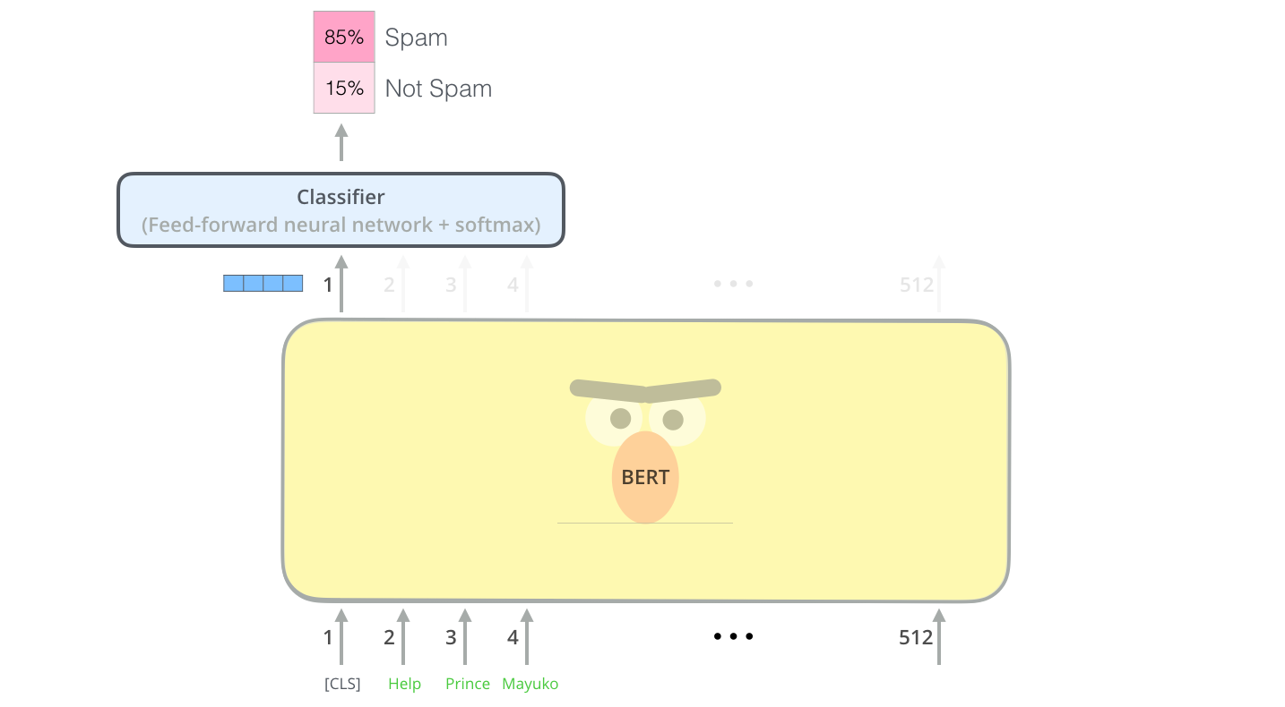 기존의 사전학습된 모델 마지막에 single-layer neural network를 분류기로 추가해서 input에 대한 output(label: Spam or Not Spam)이 출력되도록 task specific하게 fine-tuning되는 것이다.