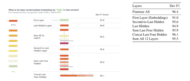 fine-tuning approach로 모든 사전훈련된 파라미터들을 조정하는 것이 가장 성능이 좋았지만, 특히 concat last 4 hidden layers의 경우에 fine-tuning 의 경우와 거의 유사한 성능을 내어 BERT가 두 가지 방식에서 모두 좋은 성능을 낸다는 사실을 확인할 수 있었다.