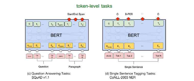 Token-level tasks, 예를 들어 QA 태스크(SQuAD : 답변의 start/end span 예측) 나 Single sentence에 대한 태깅 task (NER이나 Pos Tagging 등)도 거의 비슷하게 아래와 같은 구조로 파인튜닝이 가능하다.