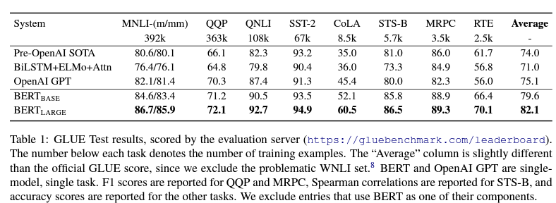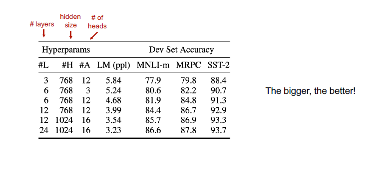- BERT BASE : OpenAI Transformer와 비슷한 사이즈로, 같은 사이즈일 때 성능 차이를 비교하기 위해 만들어진 베이스 모델