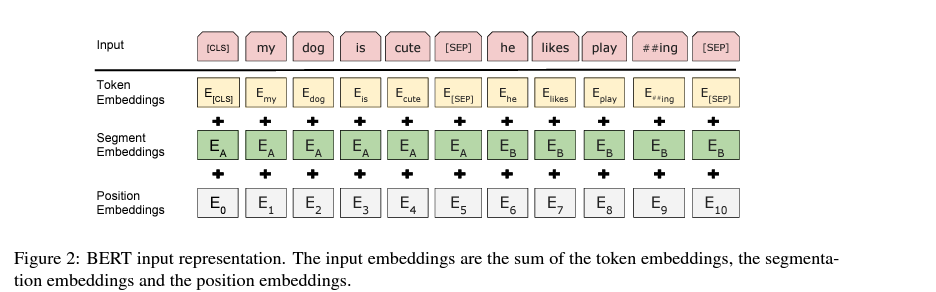 Input에 있어서는 기존의 Transformers Encoder와 큰 차이가 없다. 논문에서는 토큰의 임베딩을 위해서 vocab size가 30,000 토큰인 WordPiece embeddings (Wu et al., 2016) 을 사용한다.