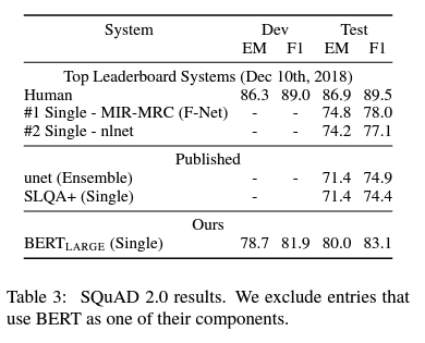 - SQuAD2.0 task extends the SQuAD1.1 problem definition by allowing for the possibility that no short answer exists in the provided paragraph,making the problem more realistic
