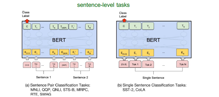 Sentence-level tasks, 예를 들어 NLI 태스크나 Single sentence에 대한 분류 task (SST-2/CoLA) 등은 아래와 같이 파인튜닝이 가능하다.
