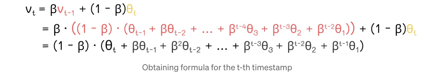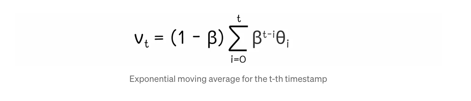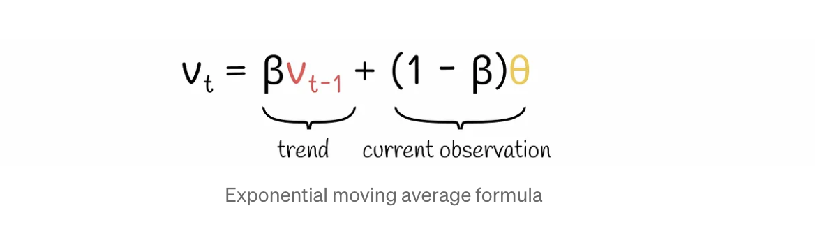 - β 는 0과 1 사이의 hyperparameter로 현재 관측치 θ와 이전 시점 smoothed value인 vₜ-₁ 사이에 얼마나 가중치를 부여할지를 의미한다.