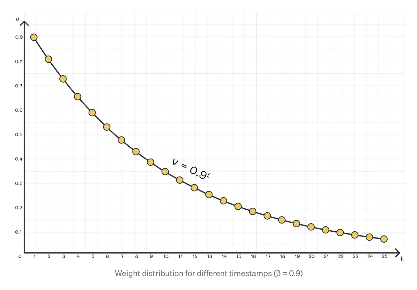 β = 0.9일때 timestamp별로 곱해지는 가중치는 아래 사진과 같이 지수적으로 감소함을 확인할 수 있다.