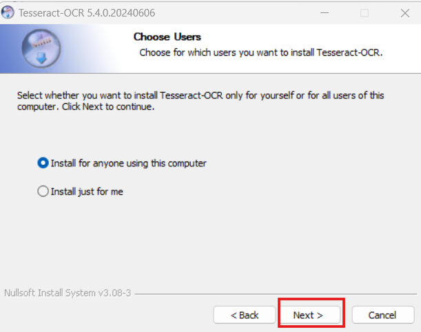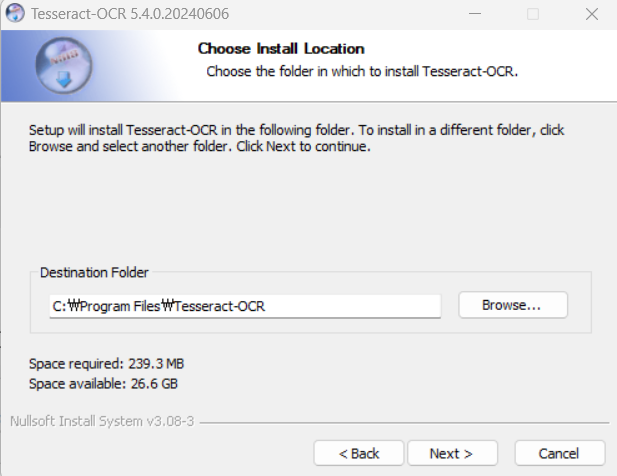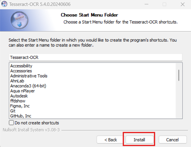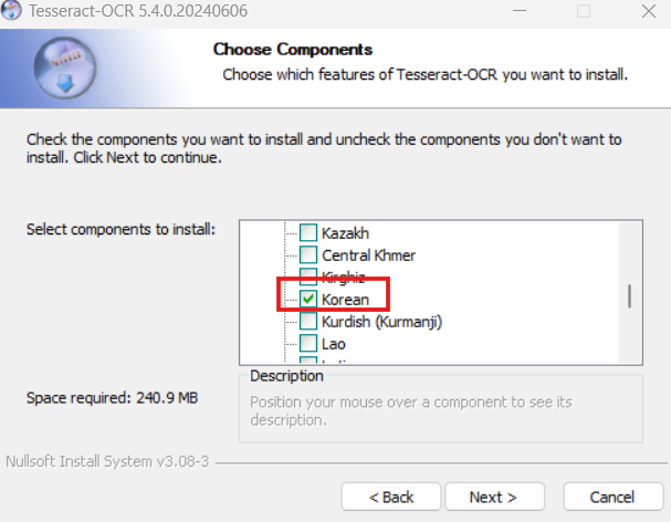 버전 따로 찾을 필요 없이 윈도우 64bit용 가장 최신 버전 (tesseract 5.4.0)이 가장 최근 installer로 떴다. (2024년 7월 7일 기준) installer를 다운받고 실행시킨다.