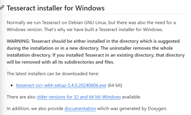 깃헙에서 Tesseract installer for Windows 를 찾아 설치한다.