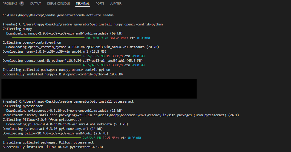 미리 만들어둔 conda python 3.9환경에서 opencv, pytersseract를 설치해준다.
